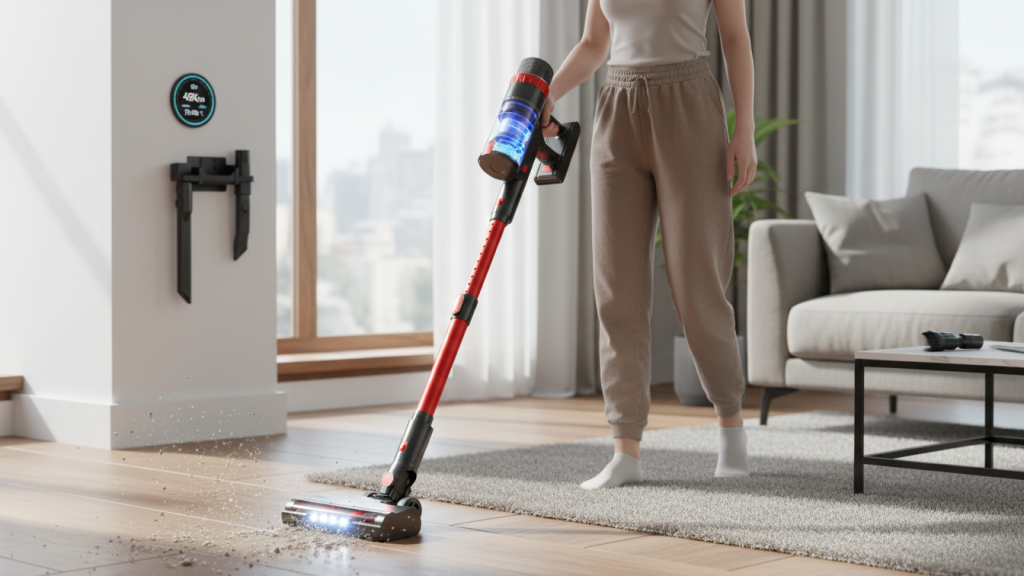 This is the kind of budget vacuum that looks “premium” on features: self-standing, anti-tangle, LED, and a long runtime spec—great for mixed floors and pet homes.