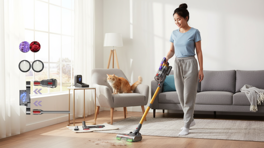 This one is aiming for “premium convenience” with a bigger 1.8L dust cup (huge plus for pets), self-standing storage, and a high-power spec. Less emptying = you’ll use it more.